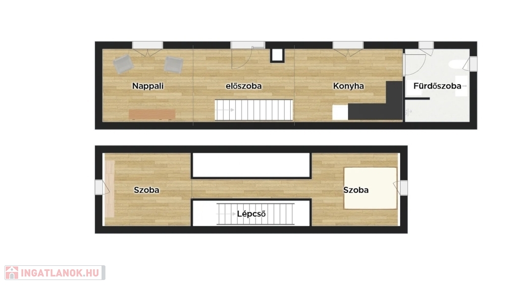 Földszint: nappali, konyha, fürdő + WC, előszoba